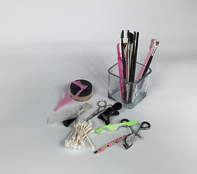 The suggested brushes for this side are angled brow brush, eyebrow brush, eyebrow comb and eyebrow spoolie, mascara fan brush and eyelash spoolie. The suggested accessories are eyebrow razors, scissors, stencils, tweezers, eyelash applicator, lashes, eyelash curler, eyelash glue, cotton swabs and mascara lash guard